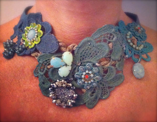 macrame' verde acqua, grigio e verde acido con pietre dure e cristalli.